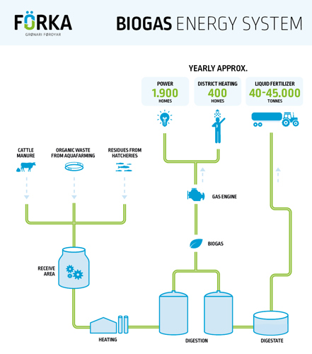 In addition, the biogas plant produces a high quality liquid fertilizer for the faroese agriculture which replacea a large amount of the manure that otherwise would be imported. This increases the farmers' production and reduces enviromental impact on imported goods.